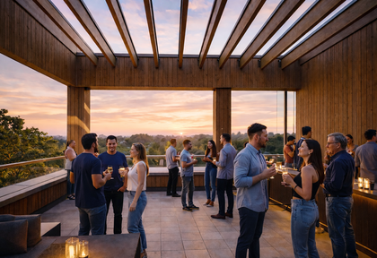 Sundowner auf der UTN-Terrasse: Netzwerken, austauschen und den Blick über Nürnberg genießen – entspannt den Tag ausklingen lassen.