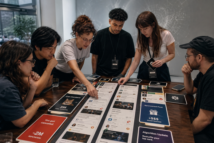 In our simulation game, participants assume different roles on a platform and make decisions from their respective perspectives. While the format is particularly aimed at young people who are familiar with such mechanisms from their own experience, it is also open to anyone who wants to understand how social media works. Each round determines what content is created, how it is prioritized, and which target audiences are addressed. Content creators compete for attention, advertisers place their messages, and platform operators decide which content appears in the feed. Users react to this selection, which shifts what receives attention in the next step. This process reveals how different interests, power dynamics, and incentive structures interact, as well as the actual scope of individual roles. This perspective makes it possible to understand and contextualize common assumptions about the impact of social media.